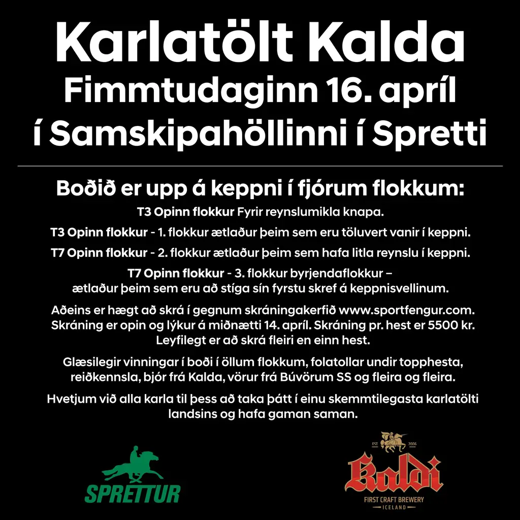Karlatölt Kalda verður haldið í Samskipahöllinni fimmtudaginn 16. apríl Boðið verður upp á eftirfarandi flokka: T3 Opinn flokkur, fyrir reynslumikla knapa T3 Opinn flokkur – 1. flokkur, ætlaður þeim sem
