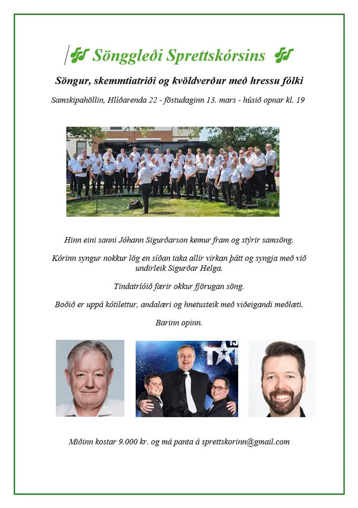 🎶 Sönggleði Sprettskórsins 🎶 Verið hjartanlega velkomin og syngið öll með, föstudaginn 13. mars í Samskipahöllinni – húsið opnar kl.