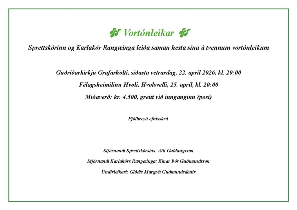 🎶 Vortónleikar 🎶 Sprettskórinn og Karlakór Rangæinga leiða saman hesta sína á tvennum vortónleikum Guðríðarkirkju Grafarholti, síðasta vetrardag, 22.