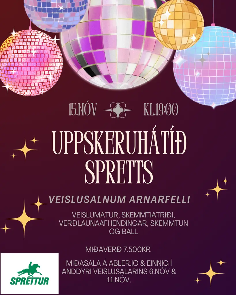 Uppskeruhátíð Spretts verður haldin með pompi og prakt laugardaginn 15.nóvember nk. í veislusalnum Arnarfelli í Samskipahöllinni. Miðaverði er stillt í