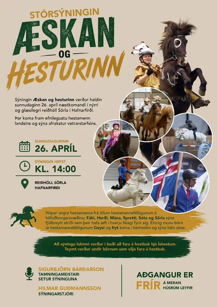 Æskan og hesturinn í Sörla 26. apríl Sýningin Æskan og hesturinn verður haldin sunnudaginn 26. apríl næstkomandi í nýrri og glæsilegri reiðhöll Sörla í Hafnarfirði. Þar koma fram efnilegustu hestamenn landsins og sýna afrakstur vetrarstarfsins og er óhætt að segja